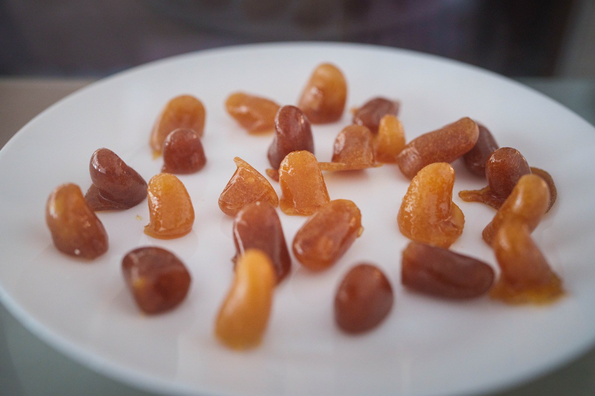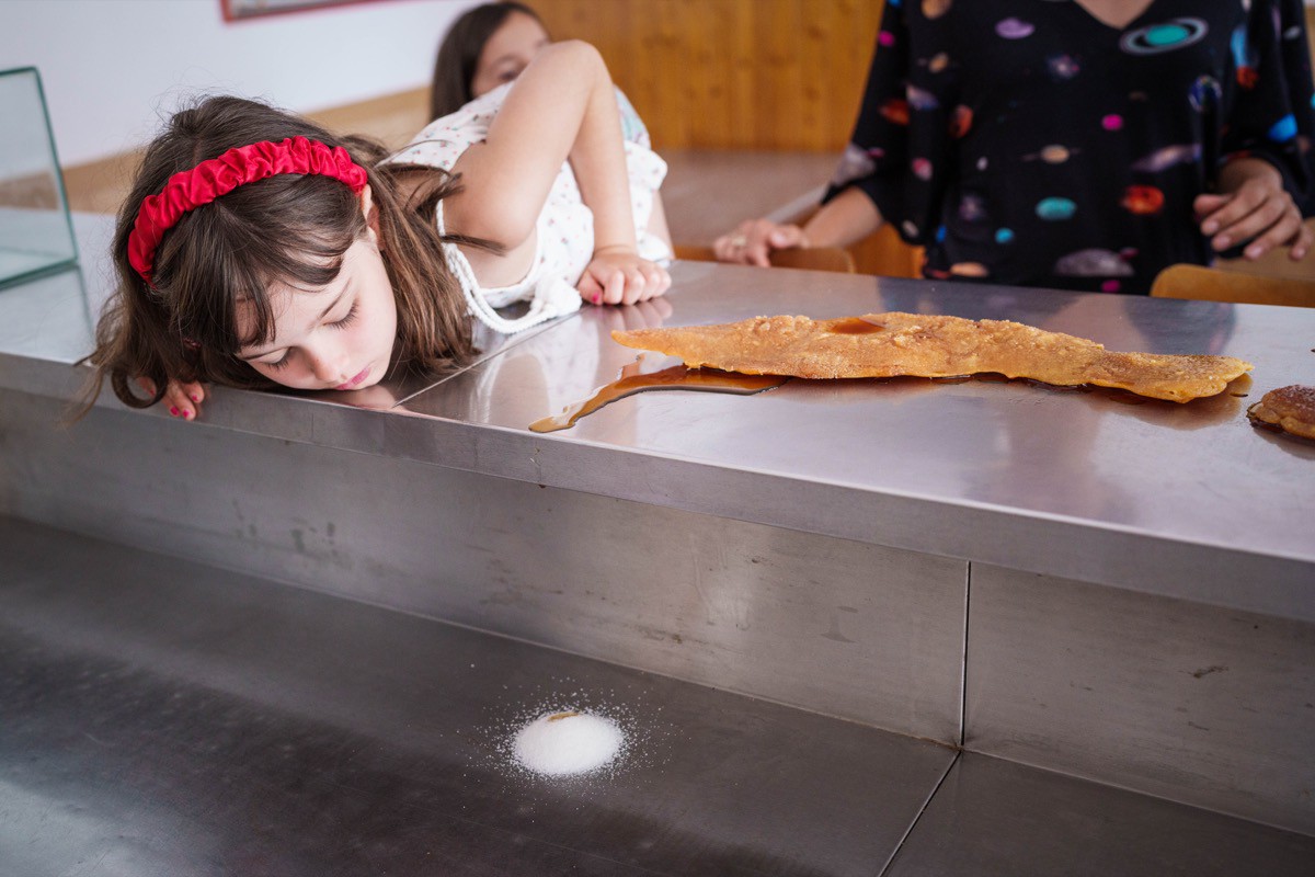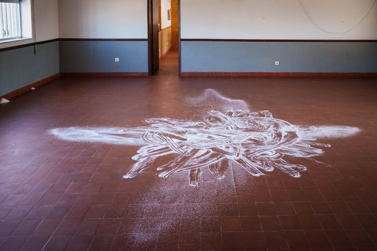 “On night with fever dreams the mosquito becomes the ruler of my freedom”, 2022. Instalação, 1kg de açucar, 350x300cm + Video, 6min + 6 objectos de dimensões variáveis, caramelo